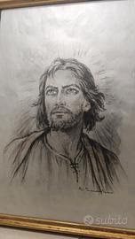 In questo Volto di Cristo, come in gran parte del suo lavoro, ľartista Giuseppe Tarantino mostra la sua abilitè nell'ottenere una perfetta resa naturalistica con una tecnica molto grafica. Il disegno, estremamente preciso, rincorre ogni particolare della fisionomia fornendoci un resoconto alquanto dettagliato mediante un tocco sfumato lartista rileva i volumi evidenziandoli plasticamente. Infine, con un vivace tratteqgio, dà vita ad un complesso gioco di ombreggiature. Giuseppe Tarantino è solito usare un segno molto più veloce e sommario per i capelli ed i contorni, in questo modo le figure risultano più vive e più mosse nello spazio. L'attenzione dell'artista viene rivolta anche al gioco deali sguardi ed all'espressione dei sentimenti che, come possiamo vedere anche in questa opera, risulta sempre intensa ed emozionale. Giuseppe Tarantino è stato un pittore palermitano nato nel 1916 e scomparso nel 1999. E' stato autore di numerosi disegni e opere di grafica in cui ha sviluppato uno studio soprattutto per la figura umana e il ritratto.