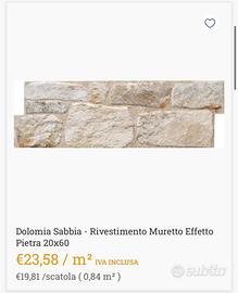 Vendo per esubero rivestimento muretto interno ed esterno effetto pietra. Produttore: Mac3, Modello: Dolomia effetto sabbia Misure a piastrella: 20x60 Disponobili N’ 26 scatole per un totale di circa 22mq Prezzo di listino lo si vede in foto (€23.50 a scatola) Prezzo richiesto: € 15 a scatola Se preso tutto in bloccco il prezzo é trattabile. Acquistato presso Edilferrarese Albignasego. Ritiro a mano, grazie. Se interessati contattatemi. Mattia: 3402893901