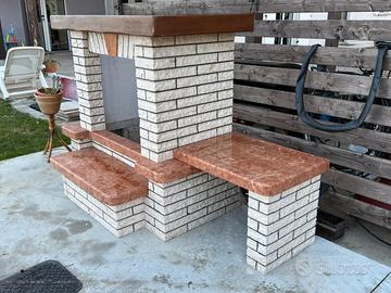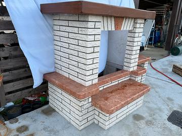 Rivestimento per camino a legna, stufa a pellet o caminetto in leca. Il rivestimento è a blocchi componibili cosi come visibile nelle foto, in marmo bianco Carrara e rosso Verona, completo della trave in legno, seduta laterale e porta legna.