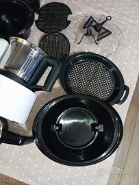 Pagato nel 2020 € 995,00 e utilizzato solo una volta per prova Robot da cucina Mastermix multifunzione che sostituisce quasi una dozzina di elettrodomestici e utensili da cucina Offre molteplici funzioni in un unico apparecchio tra cui tritare, impastare, cuocere, frullare, macinare l, pesare, ecc. ecc. Dispone di programmi automatici a livelli di velocità variabile ed impostabile dal display multifunzione Permette di cucinare una varietà di ricette tutte elencate nel liceo delle ricette (foto n. 6) Dai brodi alle salse, dai dolci agli impasti di vario genere, torte, focacce, pizze, ecc. ecc. Ha un pannello di controllo digitale con diversi pulsanti per funzioni manuali e automatiche tra cui Tempo, Turbo, Impasto, ecc. Il boccale di acciaio inossidabile ha una capacità massima che sfiora i 2 lt Include tanti accessori come lame, cestello per cottura a vapore, spatola e accessorio a farfalla