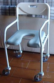 Sedia da doccia pieghevole con ruote Piroettanti. Togli il sedile di plastica e metti il sedile da comoda imbottito. NON in commercio. Allestita su richiesta. Qui con i braccioli girati internamente. Volendo si possono ruotare all' esterno se necessario per aumentare lo spazio di seduta.