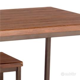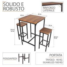 MATERIALE: Piani in pressato rivestiti di pvc colore legno simile Noce spessore 3 cm. Struttura tubolare 2,5x2,5 cm in metallo colore bronzo marrone scuro. Piedini in plastica. Utilizzo Domestico. Sono da interno. Portata tavolo 40 kg. Portata sgabello 100 kg.