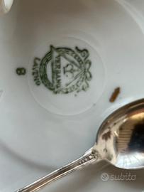 Due piatti e due tazzine in ceramica impreziosita con oro e due cucchiaini di argento 800.perfetto regalo per coppia che ama i servizi antichi di intramontabile bellezza