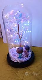 Offro una splendida rosa illuminata in una cupola di vetro, che crea un'atmosfera romantica. Questa decorazione è perfetta come regalo o per impreziosire la tua casa. È in condizioni eccellenti, come nuova e funziona perfettamente. Non effettuo spedizioni!
