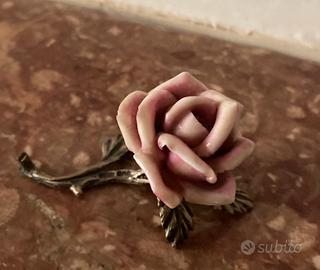 Rosa in porcellana montata su rametto in argento 800 anni ‘70 cm 6 x 3,5 patina originale
