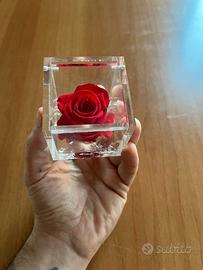 Vendo Rosa stabilizzata posta all'interno della sua teca di plastica trasparente. La rosa è trattata per rimanere intatta senza bisogno d’acqua o luce. Racchiusa in un cubo trasparente, che protegge il fiore stabilizzato da ogni imprevisto o urto. Anche ritiro a mano.