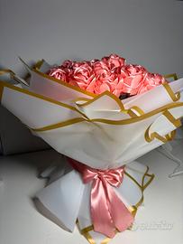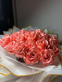 Vendo rose in raso, colore rosa fatte a mano. 26 rose alte 20cm con base di polistirolo che permette di usarle come soprammobile senza bisogno di sostegno. Bellissime sia come regalo, sia come arredamento. Non necessitano di cure, ma sono ugualmente raffinate ed eleganti, un ricordo conservabile ed indelebile.