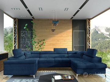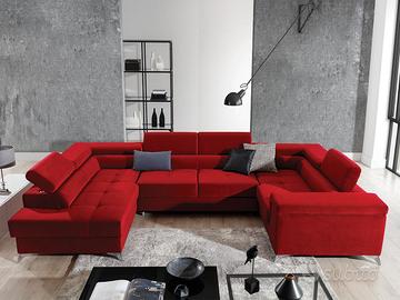 Divano letto matrimoniale angolare ad U dotato di box contenitore, in 11 affascinanti colori, senza variazioni di prezzo! Un divano letto angolare con box veramente splendido e che si distingue ed eleva non soltanto fra i nostri modelli ma anche fra tantissime proposte commerciali presenti sul mercato è senza dubbio il modello Arkansas. I motivi sono molteplici: in prima istanza il design moderno e di ultima concezione, le bellissime colorazioni in cui è proposto, le ampie dimensioni complessive e la qualità della lavorazione generale e dei suoi materiali costitutivi, che ne fanno un divano di altissimo pregio e di ottima fattura, tanto che il suo peso complessivo è di ben 225 Kg! Per quanto riguarda le due penisole hanno identica lunghezza ma differiscono poiché una ha il bracciolo all’estremità mentre l’altra è dotata di ampio angolo con seduta ai lati. Altra importante caratteristica distintiva del divano letto angolare con box a U sono i 4 poggiatesta reclinabili con movimento fine corsa, di cui due collocati nella parte centrale ed altri due posizionati nella parte esterna delle penisole, uno di fronte all’altro. I piedi di sostegno del modello Arkansas, realizzati in metallo e molto robusti, sono anche molto attrattivi nell’estetica e nel design. La qualità più importante del divano letto Arkansas è quella di avere un rapporto qualità/prezzo elevatissimo, tanto che sebbene dotato di tutte le caratteristiche sopra esposte il prezzo di vendita è decisamente contenuto! Specifichiamo che nel prezzo di vendita sono compresi i due cuscini di bellezza visibili nelle foto e dello stesso colore del divano; sottolineiamo che nella versione di colore rosso sono presenti i due cuscini di bellezza in tinta unita e non i tre cuscini differenti indicati nelle foto. Divano angolare robustissimo e di ottima qualità, dal peso di ben 225 Kg!