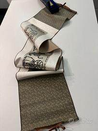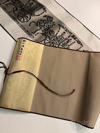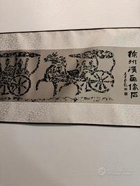 Prezioso rotolo in seta, proveniente dalla Cina, in custodia blu. Veramente elegante. Dimensioni circa cm. 157x28. Sviluppandosi in orizzontale il disegno, che raffigura una processione a cavallo con carrozze, e’ ideale per abbellire la parete dietro ad un divano.