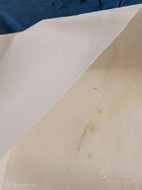 Taglio di tessuto di corredo lungo 22 metri abbondanti con altezza 240. Il colore è bianco panna e non rilevo marchiature se non il codice indicato in foto. La tela, che potrebbe a mio avviso anche essere anche un misto lino, è ottima – nel dubbio la vendo come splendido cotone. E’ ben conservata (pochissimi aloni di polvere – fotografata quella più evidente).