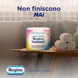Rotoloni Regina è la carta igienica bianca e decorata, lunga più del doppio dei rotoli normali