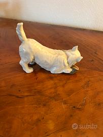 Figura vintage di cane razza West Higland White Terrier che morde una pantofola in porcellana smaltata, della prestigiosa fabbrica Royal Copenhagen no. 145. Integra, senza crepe né lesioni, disegno Ada Bonfils. Misura cm H. 10 x L. 12.