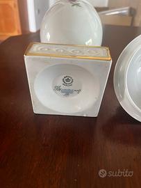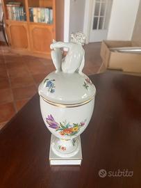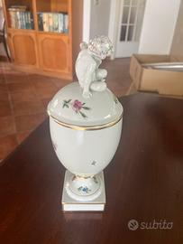vaso con coperchio della collezione Royal Copenhagen Saxon Flower. Questa serie è nota per i suoi delicati decori floreali dipinti a mano e le rifiniture in oro. La Royal Copenhagen è una manifattura di porcellane danese con una lunga tradizione di eccellenza artigianale che risale al 1775