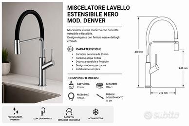 miscelatore cucina moderno con doccetta estraibile e flessibile, ideale per cucine moderne e funzionali. Design elegante con finitura nera e dettagli cromati, perfetto per dare un tocco moderno all’ambiente. ✔ Cartuccia ceramica da 25 mm ✔ Doccetta estraibile e flessibile ✔ Installazione semplice ✔ Materiali di qualità ✔ Funzione acqua fredda Completo di tutti i componenti per il montaggio: Flessibili inclusi Aeratore Cartuccia Dimensioni: Altezza: 47 cm Altezza uscita acqua: 24 cm 💧 Ideale per uso domestico o professionale 📦 Disponibilità immediata 🚚 spedizione immediata Contattami per info o per disponibilità anche di altri modelli.
