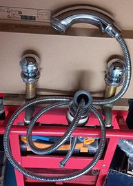 Rubinetto doppio comando a tre fori con doccino estraibile (ml 1,50), gruppo miscelatore in bronzo. Ricondizionato, revisionato e ripulito dal calcare. Funzionante con cromatura ancora in buono stato (piccole scrostature sulle ghiere delle manopole). Utilizzato su vasca ma adattabile anche a lavabi in acciaio oppure su piani con lavello da sottoincasso. Ottimo per molteplici utilizzi.