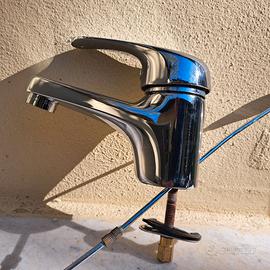 kit di montaggio con rubinetto miscelatore in ottime condizioni, tubi di collegamento acqua fredda-calda, piletta sotto-lavandino per leva di apertura tappo di svuotamento. Viene venduto per cambio di sanitari con tutti i pezzi in foto compresi nel prezzo richiesto. Il miscelatore funziona benissimo, la leva si sposta in modo dolce e progressivo. Il filtro arieggiatore e' nuovo. L'altezza, come da foto, e' circa 10 cm dal foro del sanitario.