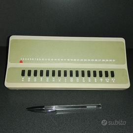Rubrica automatica, in plastica, color verde salvia e grigio tortora chiaro. Con indicatore del giorno del calendario perenne color rosso. 16 tasti di color nero. Numeri e lettere di colore bianco. Completo di tutti i fogli bianchi, mai usati, con le lettere corrispondenti al tasto. Sul foglio della lettera R c'è una piccola macchia. Presenti alcuni aloni e un segno molto leggero di pennarello nero, soprattutto nella parte inferiore. Koller design - Hansa - Made in Germany modernariato vintage anni '70 Dimensioni: 26,7 cm larghezza 10 cm altezza 11.5 profondità 15.5 cm profondità con scheda aperta