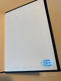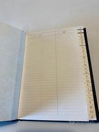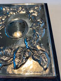 Rubrica con copertina in lamina d'argento, con decorazione a foglie, in scatola originale e bollino di acquisto presso una gioielleria. Misure: lunghezza cm. 16, larghezza cm. 12,5, h. cm. 1.