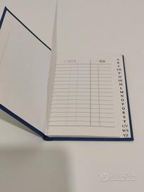 Piccola rubrica telefonica con copertina in stoffa azzurra. Sul davanti presenta una lastrina in argento. Misura 11 x 7,5 cm e mezzo centimetro di spessore.