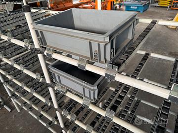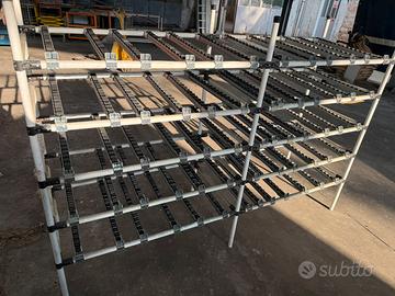Sono scaffali con rulli attualmente regolati per contenitori come da foto. Si possono modificare altezza e inclinazione