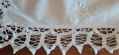 Questo splendido pezzo d'antiquariato è un realizzato in pregiato lino bianco e arricchito da un elaborato pizzo lavorato a mano. La lavorazione, all'uncinetto, presenta un motivo a merletto intricato che ne decora l'intero perimetro, conferendo un tocco di eleganza e artigianalità.