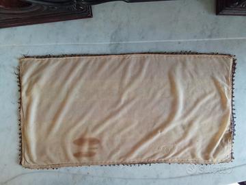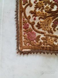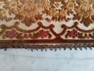 Runner da tavolo, tovaglia centrotavola antica in velluto damascato con motivo floreale vintage e bordo in pizzo metallizzato oro (da restaurare).