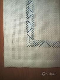 Runner da tavolo in Tela Aida di puro, colore bianco ricamato a punto filxa in sfunature di azzurro. Misura cm 82 x 38.