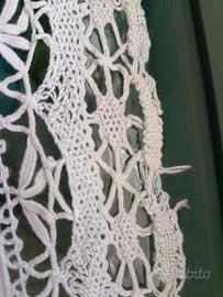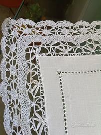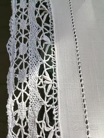 Runner lungo 86 cm. x 26 cm. di larghezza. Realizzato in lino con inserti in pizzo fatti a mano. Unico difetto, in un punto si è sfilato un po' di cotone della bordatura, ma si può cucire facilmente .