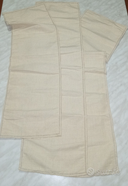 Runner rustici realizzati in lino/tela grezza, con orlo a giorno fatto a mano a fili contati. Hanno bisogno di una stiratura. Misure: i primi due cm 29×102 circa, il terzo cm 28×86 circa. Set da 3 € 110,00, pezzo singolo € 40,00.