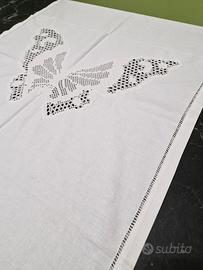 Elegante runner da tavola vintage in lino bianco, impreziosito da inserto centrale in pizzo filet all’uncinetto.