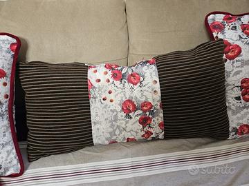 N. 1 RUNNER LETTO MISURA CM 230X88 N.2 CUS.CON CERNIERA S.IMBOTTITURA BORDO ROSSO CM48X48 N.2 CUS.CON CERNIERA S. IMBOTTITURA BORDO GRIGIO CM44X44 N.2 CUSCINI CON FIORI CM39X39 N.1 CUSCINO RETT. CM57X29 N.1 CONTENITORE ROSSO CM38X38XH39