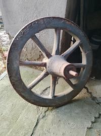 Ruota in legno di un carro antico, con un aspetto vissuto e rustico.