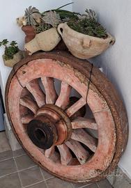 Antica ruota di carro in legno, ora utilizzata come elemento decorativo, oggetto d'arredo rustico o vintage.