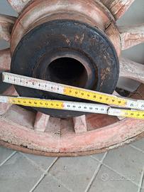 Realizzata in legno con un cerchio metallico esterno di 3cm e un mozzo centrale in ferro, diametro circa 85cm