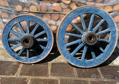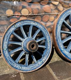 Vendo ruote in legno antiche, verniciate a mano con un elegante design blu e dettagli decorativi.