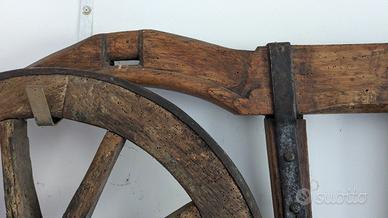 2 Ruote di carro 70 cm. di diametro e giogo largo 120 cm. antichi, idea per arredamento. Vendo anche separatamente: 1 ruota 180 - giogo 150