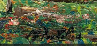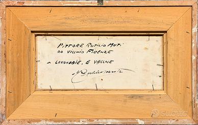 Rutilio Muti (Vicchio di Mugello (Fi), 1904 - 1995) Lavandaie e vacche olio su tavoletta, cm 15x35 firmato in basso a destra, al verso firmato e titolato