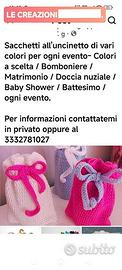 Ciao a tutti. Si realizzano sacchetti (a uncinetto di filo, di vari colori a scelta), porta confetti per bomboniere. 6€ l'uno. Per informazioni contattatemi in privato. Se avete idea di una creazione precisa con colori e materiali dell'oggetto che vorreste, ditemelo. Creazioni fatti con l'uncinetto per neonati-infanti-bimbi come: bavaglini, scarpine, neonati, cappellini, sacchetti all'uncinetto porta confetti fatti a mano di vari colori scelti da voi e tante altre cose per ogni evento. Si realizzano creazioni- creazioni -bomboniere-creazioni all'uncinetto- creazioni con vari materiali- sacchetti porta confetti fatti a mano di vari colori a scelta, idee regalo, bigiotteria, confezioni regalo🎁, torte decorative per vari eventi, porta cialde, quadretti ricamati a mano🖼, quadretti decorati 🖼, quadretti porta chiavi ricamati a mano🖼, creazioni per halloween, presepi, case fatate, paesaggi natalizi, palle natalizie , orecchini, bracciali, collane, anelli 💍 Bomboniere e decorazioni per ogni evento con colori, nomi a scelta per vari eventi come compleanni, coccarde nascita, bavaglini nascita, comunioni, cresime, matrimonio, regali che si fanno alle insegnanti e tante altre cose, creazioni per ogni evento con colori, nomi, materiali a scelta da voi. Creazioni-bomboniere per ogni evento, per ogni occasione come: -nascita (coccarde 🎀, bavaglini, scarpine, scialle, cappellini , copertine per culle e carrozzine, sacchetti porta confetti, bomboniere e tant'altro), battesimi, comunioni, cresime, promesse di matrimonio, matrimonio, compleanni🎁, lauree, Halloween, Natale, la Befana, San Valentino, Pasqua, San Patrizio,. Creazioni con colori e nomi a scelta come: -creazioni all'uncinetto di filo o di lana come foulard, sciarpe, guanti, presine, centrini, bomboniere, borselli, borse.👛👜