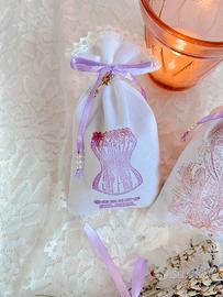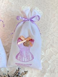 Tris di sacchetti di lavanda confezionati a mano, in cotone leggero, decorati con timbri vintage, fiocchi di raso, charms in metallo, perle e pizzo di cotone. Lavanda del 2024. Sono tutti diversi.