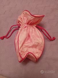 Sacchetto porta oggetti in cotone color rosa con nastri decorativi color fuxsia. Dimensioni h 25 cm per un diametro di 12 cm.