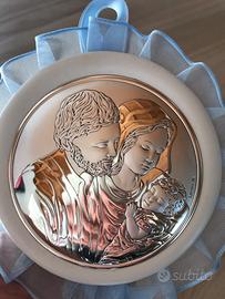 Sacra famiglia in laminato argento con passamaneria azzurra e retro in ecopelle bianca. Da appendere al muro della cameretta. Nuova nuovissima!