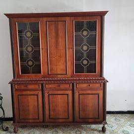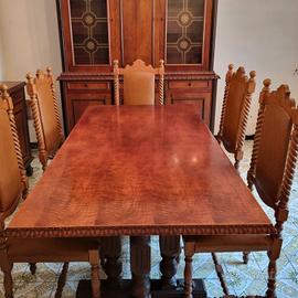 Composta da : Tavolo, 6 sedie con imbottitura su seduta e schienale, comò con specchiera, armadio con vetrinetta.