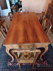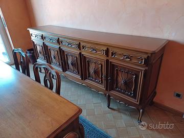 Bellissima sala in stile barocco piemontese interamente in legno, composta da 2 madie con ante e cassetti decorati con intarsi a rilievo di pregevole fattura e di un tavolo con allunghe e 6 sedie imbottite con seduta in elegante velluto.