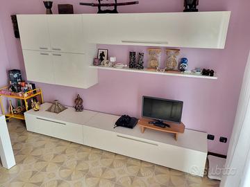 Sala bianca composta 2 cassettoni a terra 1 cassettone appeso 1 quadrato appeso con 4 ante 1 mensola 1 tavolo