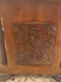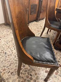 Bellissima sala completa stile Art Déco, in radica di noce, composta da tavolo, 6 sedie in radica, e 2 mobili uno con specchiera ed uno con alzatina, finemente rifinita con bassorilievi fatti a mano, da notare il particolare dello schienale pieno delle sedie tipico di questo stile.