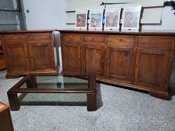 n.1 Credenza bassa/madia lunga cm 220x50 mobile a corpo unico di legno massello con 4 battenti nella parte inferiore e quattro cassetti allineati sotto il piano. al prezzo di Euro 900.