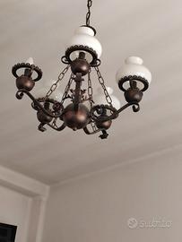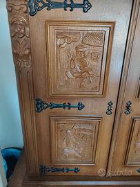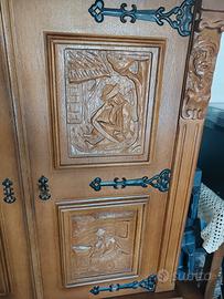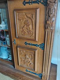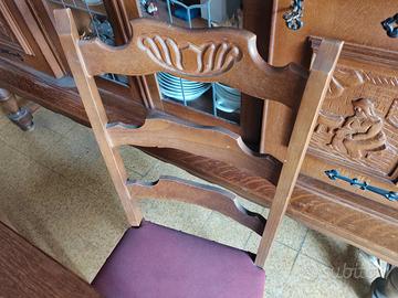Il set in legno massello comprende: 1 Credenza/Vetrina Grande: Mobile imponente con ante intagliate, parte centrale a vetrina con vetri lavorati a piombo e cerniere in ferro battuto brunito. 1 Mobile Dispensa/Bar: Coordinato alla credenza, con ante finemente scolpite e ampi spazi interni. Tavolo da pranzo: Grande tavolo rettangolare in legno massello, molto robusto, con gambe tornite. Set di Sedie (6 pezzi): Sedie coordinate con schienale intagliato e seduta imbottita in color bordeaux. Lampadario in omaggio: Lampadario in ferro battuto con globi in vetro bianco, perfettamente abbinato allo stile della sala. Manca una boccia in vetro SOLO RITiRO. prezzo trattabile quarto piano senza scensore