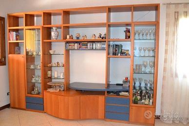 Mobile sala componibile della ditta friulana “Presotto” modello Pari e Dispari con libreria e capienti elementi contenitori alternati a vetrine. Design moderno impiallacciato noce e laccato opaco blu. Misure Parete: L. 337 cm profondità 38,5/59 cm. h. 230 cm. I moduli sono componibili per cui può essere montata a misura anche più corta. Marca di ottima qualità. Regalo il tavolo allungabile 100 x 100/156 e 4 sedie imbottite blu.