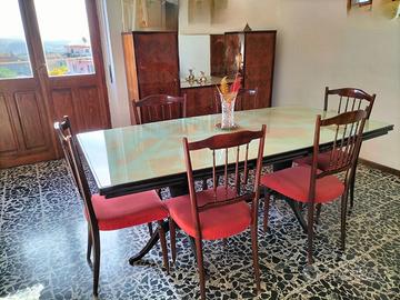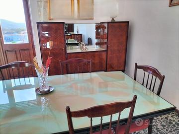 Buffet e contro buffet con piano vetro, tavolo rettangolare con piano in vetro, 6 sedie imbottite. Lavorazione artigianale tutto in legno stile anni 60