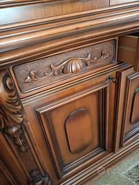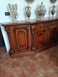 sala da pranzo in stile in legno intarsiato risalente anni 80 circa composta da cristalliera alta con vetri molati , mobile basso con una piccola rottura sul piano , tavolo e sei sedie ancora con nylon di protezione , usata pochissimo vendo anche pezzi separati il trasporto è a carico dell' acquirente ...